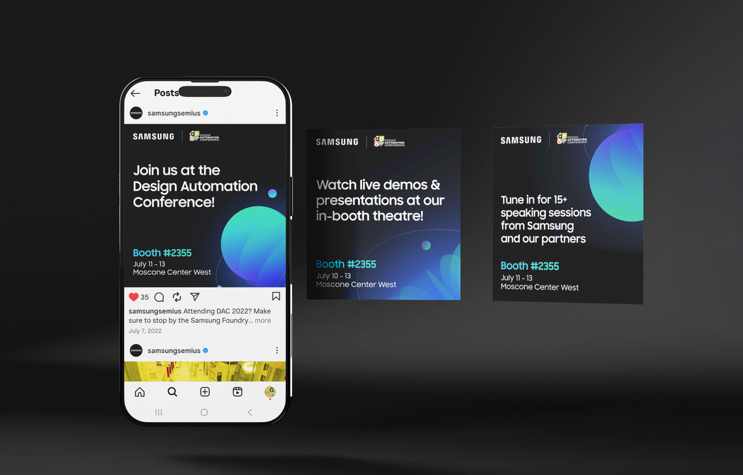Samsung Foundry participates in the Design Automation Conference, which focuses on semiconductor and electronic system design. The event branding required a key visual that reflected the company’s robust ecosystem, partnerships, and advanced technology, creating a cohesive presence throughout the conference.